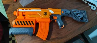 Pistola de juguete Nerf Elite en colores naranja y gris. Diseñada con un estilo futurista y un cargador extraíble. El precio es por las cuatro