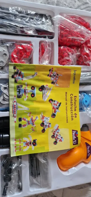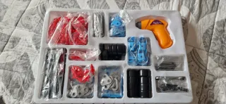 Estuche de construcción con diversas piezas y un taladro de juguete. - Incluye piezas de construcción en rojo y azul. - Contiene ruedas negras. - Incluye un taladro de juguete naranja.