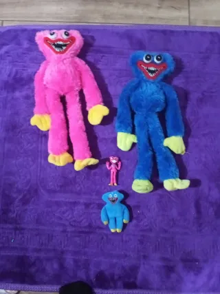 Pack de cinco juguetes del personaje Huggy Wuggy. - Peluche rosa grande. - Peluche azul grande. - muñeco rosa pequeño. - Peluche azul pequeño. Muñeco negro