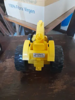 Tractor de juguete con pala frontal, ideal para juegos. - Color principal amarillo con detalles en gris y blanco. - Ruedas grandes y robustas. - Pala frontal articulada.
