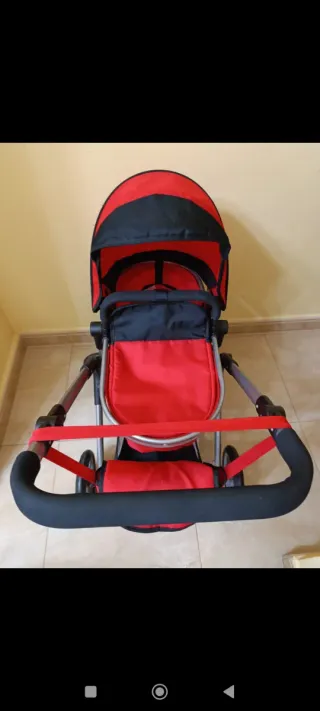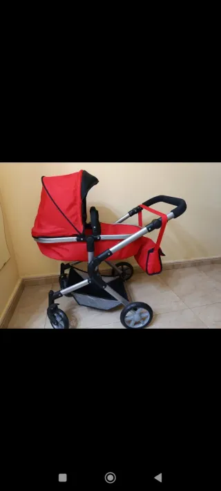 Carrito de juguete para muñecas, ideal para juegos de simulación. Su diseño llamativo lo hace muy atractivo. - Color rojo vibrante. - Estructura metálica y textil. - Incluye cesta inferior y bolso. - Ruedas giratorias para fácil manejo.
