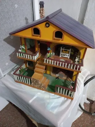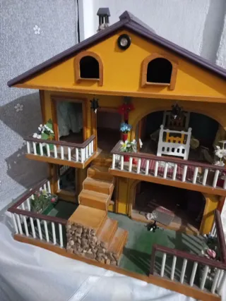 Casa de juguete de madera con varios niveles y balcones. - Chimenea decorativa. - Escaleras de acceso. - Balcones con barandillas. - Pequeños detalles decorativos como flores y leña.