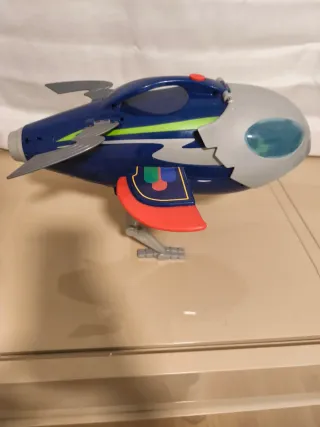 Este avión de juguete tiene un diseño futurista y divertido. - Alas laterales grises. - Ventanillas ovaladas. - Detalles en verde y rojo.