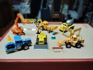 Conjunto de juguetes de construcción para recrear escenas de obra. - Incluye excavadora, camión hormigonera, rodillo compactador y más. - Varios vehículos y accesorios temáticos. - Ideal para coleccionistas o juego infantil.