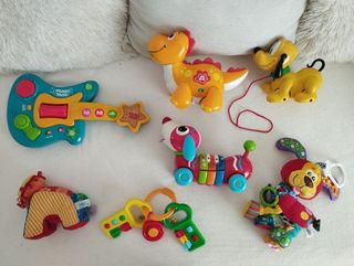 Conjunto de juguetes electrónicos de marcas reconocidas como Chicco y El Corte Inglés.con sus pilas nuevas. - Guitarra musical interactiva. - Dinosaurio con luces. - Perro Pluto. - Perro-tren. - Peluche de caballo. - Juguete de llaves. - Peluche de perro con accesorios.