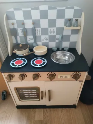 Divertida cocina de juguete de madera con accesorios. - Incluye varios utensilios de cocina. - Diseño con fogones, horno y fregadero. - Estantería superior para guardar. - Pomo de horno y mandos giratorios. En Amazon cuesta 65€