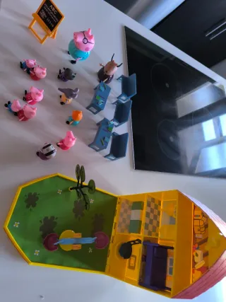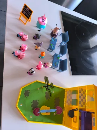 Set de juego de Peppa Pig que incluye su casa y el colegio. - Figuras de Peppa Pig y amigos. - Mobiliario escolar. - Casa con diferentes estancias.