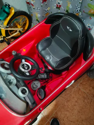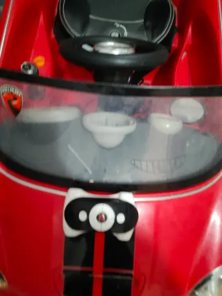 Coche de juguete de color rojo con detalles en negro y rayas. - Volante. - Asiento. - Parabrisas. - Panel frontal con botones.