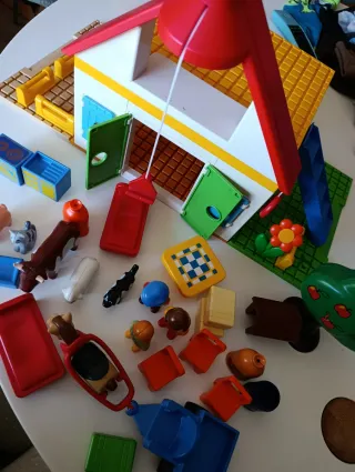 Conjunto de juguetes y puzzles infantiles. - Puzle de animales de granja. - Puzle de animales del bosque. - Puzle de vehículos y globos. - Puzle de animales de la selva. - Arcoíris de madera. Algunos están en muy buen estado y otros están más usados con algún defecto/pintada, por eso lo vendo tan económico.