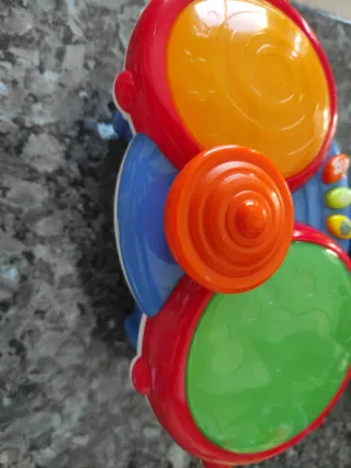 Juguete musical interactivo con tambores y platillos. - Tambor superior de color verde. - Tambor inferior de color naranja. - Platillo central de color naranja. - Botones de colores con sonidos.