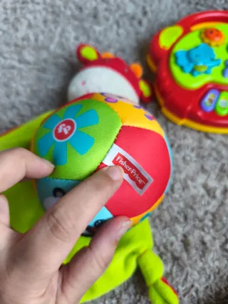 Lote de varios juguetes para bebé: - Torre de vasos apilables de colores con detalles de animales, perfectos como moldes de plastilina. - Pelotas de diferentes texturas y diseños, una con luz, otra de cascabel y otra blandita de la marca Fisher Price. - Peluche de león con sonajero ideal para colgar en el coche o en el carrito cuando son recién nacido, tiene un sonido precioso. - Dos calcetines-títere de cebra para ponérselos y que experimente el sonido y la coordinación mano pie. - y unas tuercas de piezas grandes perfectas para empezar a desarrollar la psicomotricidad fina. Más lotes con descuentos en mi perfil, échale un vistazo