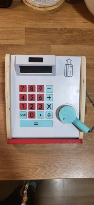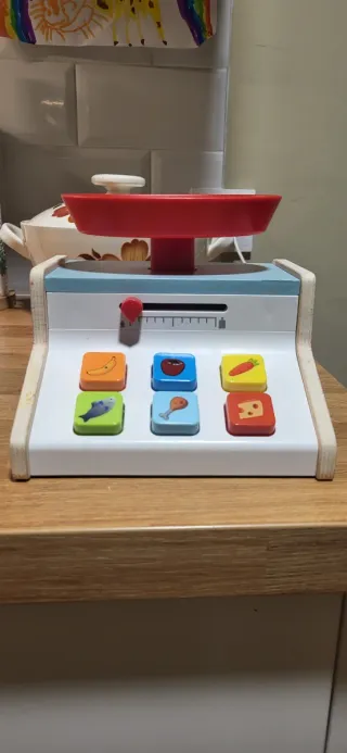 Juguetes madera: balanza y caja registradora