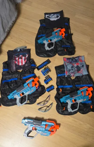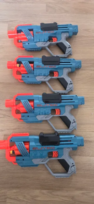 Se venden cuatro pistolas Nerf Elite 2.0 Commander. - Color azul y naranja. - Con accesorios para las balas, chalecos bufandas, gafas de protección y muchas balas.
