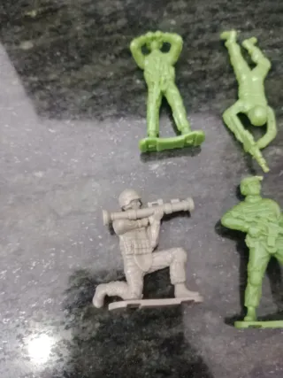 Conjunto de figuras de soldados de juguete. - Figuras de plástico. - Varios colores: verde, beige y blanco. - Diseños variados de soldados en acción.