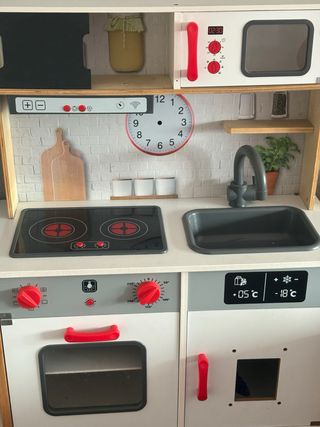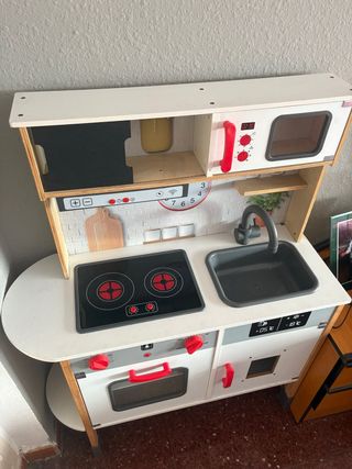 Se vende cocina de juguete de madera, con un año de uso y en perfecto estado. - Diseño moderno y funcional. - Incluye horno, microondas, fogones y fregadero. - Mandos y tiradores de colores vivos.