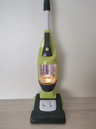 Aspiradora de juguete con un diseño divertido y colorido, ideal para que los más pequeños jueguen a limpiar. Funciona a pilas.