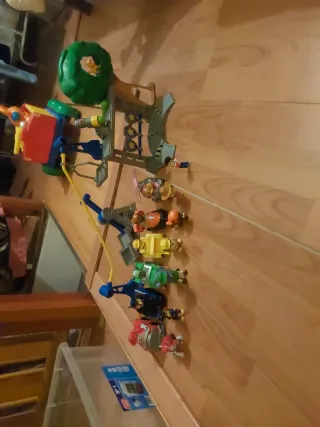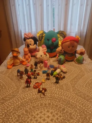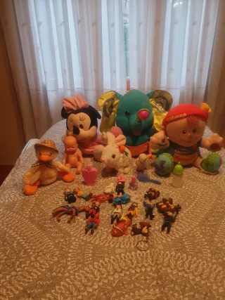 Conjunto de juguetes diversos, ideal para coleccionistas o para regalar. - Incluye peluches, figuras de acción y muñecos. - Variedad de personajes y temáticas. El muñeco de la gorra roja tiene pilas y habla