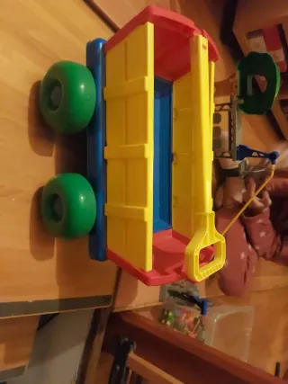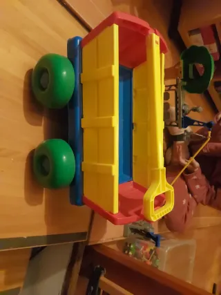 Carretilla de juguete con ruedas verdes y estructura de plástico. - Carrocería amarilla y roja. - Ruedas de gran tamaño.