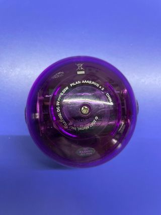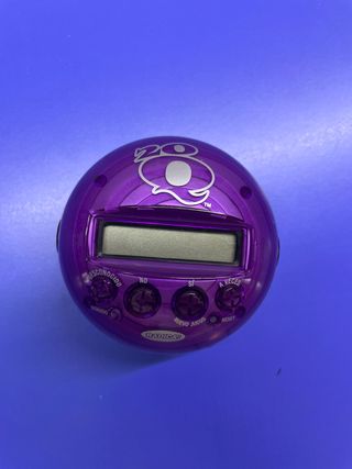 Juguete electrónico de adivinanzas. Funciona. Hay que cambiar la pila. - Diseño redondo y morado. - Pantalla LCD. - Botones con texto en español: Desconocido, Sonido, No, Sí, A Veces, Nuevo Juego, Reset. - Marca Radicas.