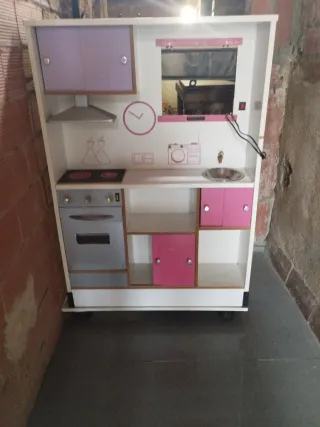 Divertida cocinita de juguete con diseño moderno y colorido.tiene agua y luz en cocina y radio - Incluye horno, vitrocerámica y fregadero. - Puertas de armario en color rosa y lila. - Reloj decorativo y accesorios de cocina. - Fabricada en madera y plástico resistente.
