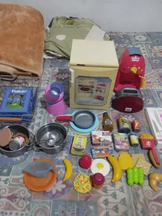 Lote de accesorios para cocinita de juguete. El frigorífico y batidora cafetera y microondas funciona. La lavadora no. - Incluye varios utensilios de cocina, alimentos de plástico y electrodomésticos. - Ideal para juegos de imitación y desarrollo de la imaginación.