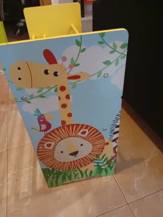 Práctico organizador de juguetes con estructura de madera y cubos de tela. - Estructura de madera amarilla. - Cubos de tela en color amarillo y verde. - Diseño infantil con animales (jirafa, león). - Tres niveles con cuatro cubos en total. -Gancho para collar en pared si se quiere