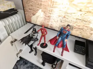 Figuras de acción de los icónicos superhéroes Superman y Flash. - Figura de Superman con traje azul y capa roja dos cabezas y su caja mide 24 cm como nuevo - Figura de Flash con traje rojo de 17 cm como nuevo - Figura de Batman con traje gris y capa negra. Este esta en condiciones aceptable