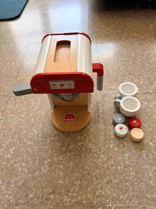 Juego de cafetera expreso de madera. Incluye varios accesorios: 2 tazas y 4 capsulas de café.