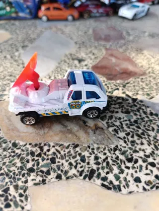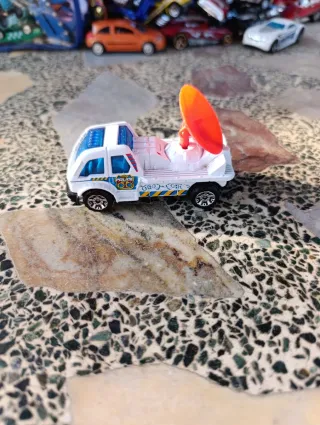 Camión de juguete de policía con antena de radar. - Diseño blanco con detalles azules y amarillos. - Antena de radar naranja. - Ruedas negras.
