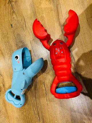 Set de dos divertidos juguetes para la playa o piscina. - Un cangrejo rojo. - Un pez azul.