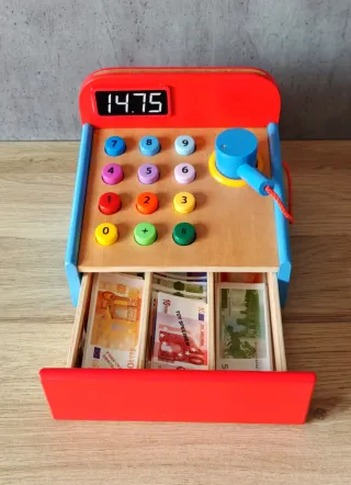 Caja registradora de juguete fabricada en madera, con un diseño colorido y divertido. Con billetes para jugar - Incluye billetes de juguete de diferentes valores. - Cajón extraíble para guardar el dinero. - Teclado numérico y pantalla de juego.
