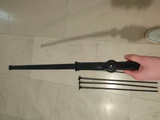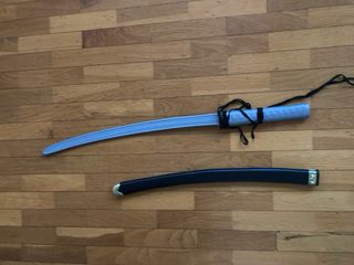 Sable de juguete con empuñadura azul y cordón negro. - Funda negra curva. - Empuñadura con cordón negro. - Detalle metálico en la punta de la funda.