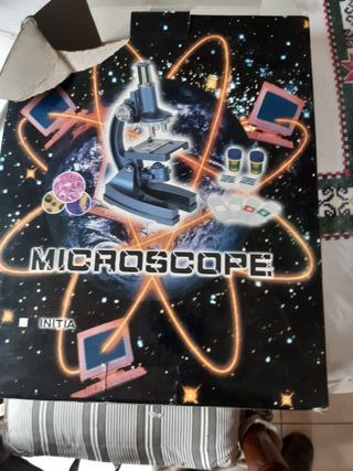 Microscopio de juguete de color azul, diseñado para niños. Incluye varios accesorios para experimentar. - Microscopio de plástico y metal. - Dos botes pequeños con etiquetas SEA SACT y GUM. - Portaobjetos y cubreobjetos. - Pipeta de plástico.