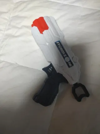 Pistola de juguete con diseño llamativo. - Color blanco y negro con detalles en rojo. - Etiqueta STORM-Z-ONE en el lateral.