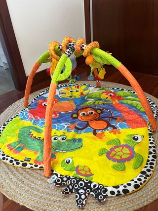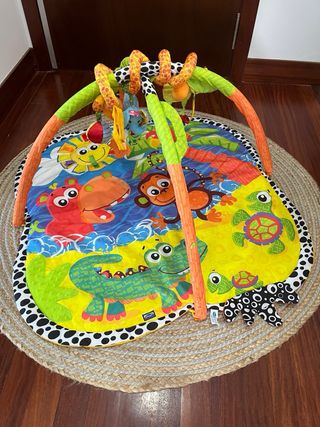 Gimnasio de actividades para bebés con un diseño colorido y divertido. - Incluye un arco superior con varios juguetes colgantes. - La alfombra presenta ilustraciones de animales como cocodrilos, monos y tortugas. - Borde de la alfombra con estampado de lunares blancos y negros.
