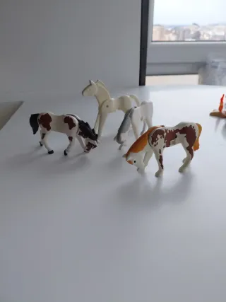 Conjunto de figuras de caballos de Playmobil.Tres de ellos tiene holgura en la cabeza y no se sostiene bien - Incluye cuatro caballos de diferentes colores y diseños. - Ideal para coleccionistas o para jugar.