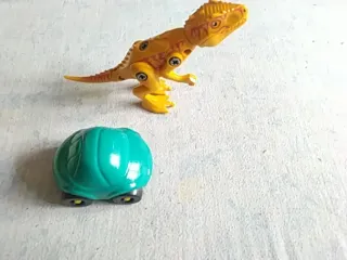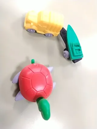 Pack de dos juguetes sorpresa con forma y tamaño de huevo kinder: - Furgoneta amarilla con remolque de lancha verde con base negra. - Incluye tortuga roja con cola verde que mueve las patas al arrastrarla. Contesto tlf/sms, telegram o mensajes milanuncios/fb marketplace. Acepto pagos en metálico, PayPal o Bizum.