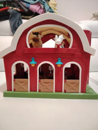 Divertida granja de animales de juguete, ideal para los más pequeños. Fabricada en plástico resistente con colores vivos. - Diseño de granja roja con puertas y ventanas. - Incluye figuras de animales. - Base verde con detalles de césped.