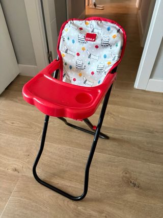 Trona de juguete con un divertido estampado de gatitos y perritos. Es plegable y fácil de guardar. - Estructura metálica. - Bandeja de plástico roja. - Asiento acolchado con estampado. - Portavasos integrado. En perfecto estado. Marca Goula.