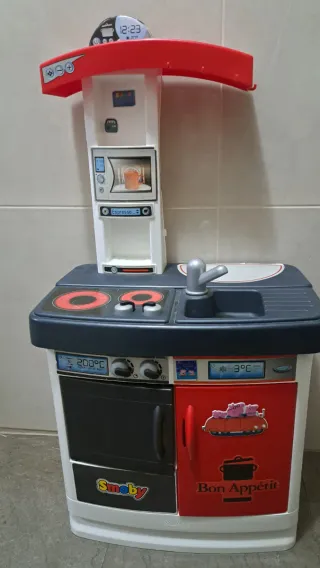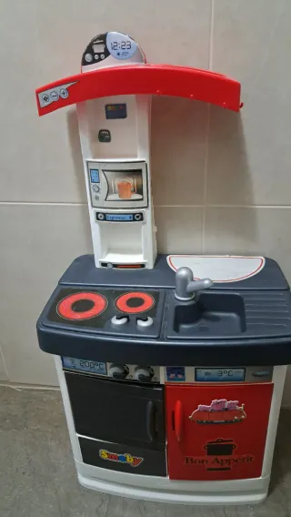 Divertida cocina de juguete de la marca Smoby. - Incluye fogones, horno y microondas. - Grifo y fregadero. - Reloj y accesorios decorativos. - Despensa trasera - Accesorios TODO LO QUE SE VE EN LAS FOTOS, SOLO ENTREGA EN MANO EN SEVILLA.