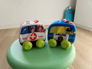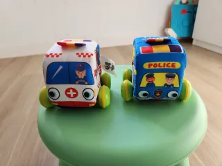 Set de dos coches de juguete blandos para bebé, uno de policía y otro de ambulancia. Son ideales para los más pequeños. - Diseño colorido y atractivo. - Materiales suaves y seguros. - Ruedas que giran. Se desenfundan para lavar.