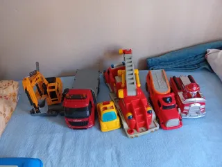 Conjunto de juguetes de vehículos de construcción y emergencia. - Camión excavadora amarillo y negro. - Camión plataforma gris y rojo. - Camión de bomberos rojo con escalera. - Camión rojo con plataforma. - Vehículo amarillo y azul.