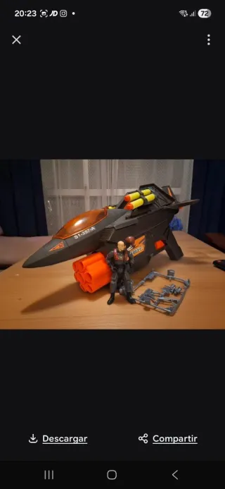 Set de juego con una pistola de juguete con diseño de jet y una figura de acción. - Pistola de color negro y naranja con detalles de misiles. - Figura de acción con traje táctico.