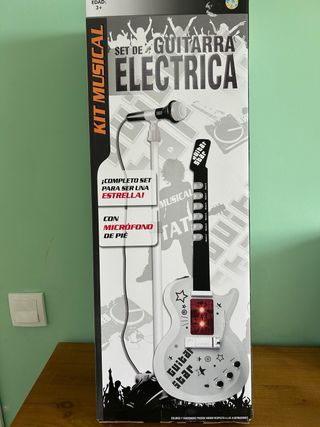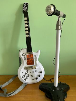 Divertida guitarra eléctrica de juguete Guitar Star con micrófono sin usar. - Guitarra de color blanco con detalles de estrellas. - Incluye micrófono con soporte. - Correa para colgar la guitarra. - Necesita 3 pilas AA, no incluidas