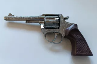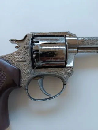 Antigua pistola revolver de juguete (años 80) de la marca española Dyal. Con un diseño detallado y acabado metálico. ✅Grabados ornamentales en el cañón y el armazón. ✅Empuñadura de color marrón con textura. 🇪🇦Fabricado en España. ✴️Funciona mediante corona de 12 capsulas (solo detonación leve, no hay que olvidar que es un juguete de época y está diseñada para que no cause daños) ✨Buen estado de conservación y funcionamiento✨ 📌NO NEGOCIABLE👈