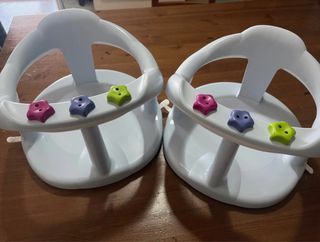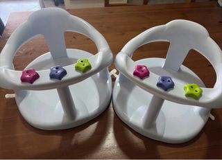 Asiento de seguridad para el baño del bebé, con divertidos juguetes. - Dos unidades disponibles. - Juguetes en forma de estrella de colores. - Diseño blanco y ergonómico. - No se han utilizado nunca, tienen aun la etiqueta por debajo. Las dos por 18€, 1 sola unidad 10€