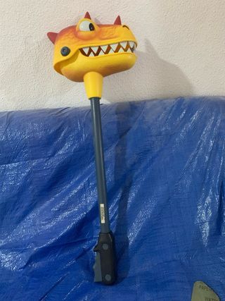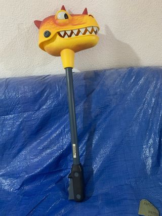 Divertido juguete con forma de dinosaurio. - Cabeza de dinosaurio amarilla y naranja. - Dientes blancos y ojos saltones. - Mango gris y negro.
