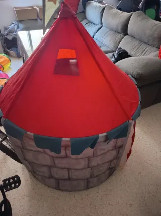 Divertida casa de juguete con diseño de circo. - Estructura de tela roja y paredes con estampado de ladrillos. - Puerta de entrada con cortinas de rayas rojas y blancas.