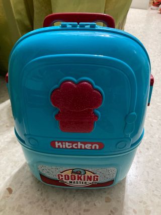 Cocinita de juguete portátil con diseño llamativo. - Color azul brillante. - Detalle de chef en color rojo. - Etiqueta Kitchen en la parte frontal. - Diseño Cooking Master en la base.