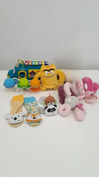 - Autobus con Xilófono y formas - 3 sonajeros con ventosa animales marinos - Espiral - Set de calcetines y pulseras con sonajero - Peluche monstruo de colores También se venden por separado o con juguetes de otros lotes de mi perfil
